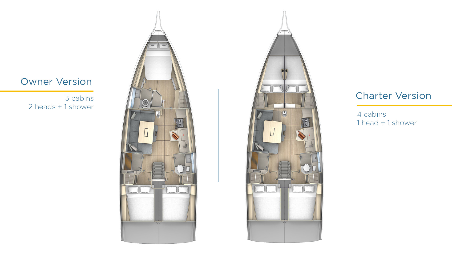This new sailing yacht is offered in two versions: either 3 or 4 cabins. Both versions have a similar configuration, with each version featuring a spacious saloon, a functional and central fore-and-aft galley, as well as twin aft cabins with good headroom.