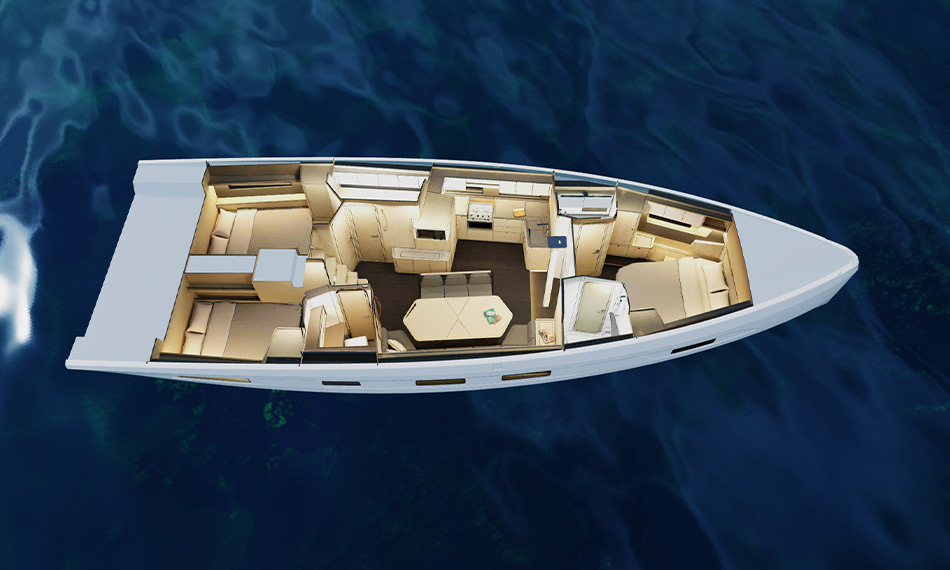 Una vez que haya decidido las distintas características exteriores de su velero, entre en la cabina para elegir entre una cocina frontal o lateral. Puede proyectarse instantáneamente entre estas dos versiones y seleccionar la que mejor se adapte a su calendario de navegación. Decida los diferentes espacios de su velero Dufour 48: