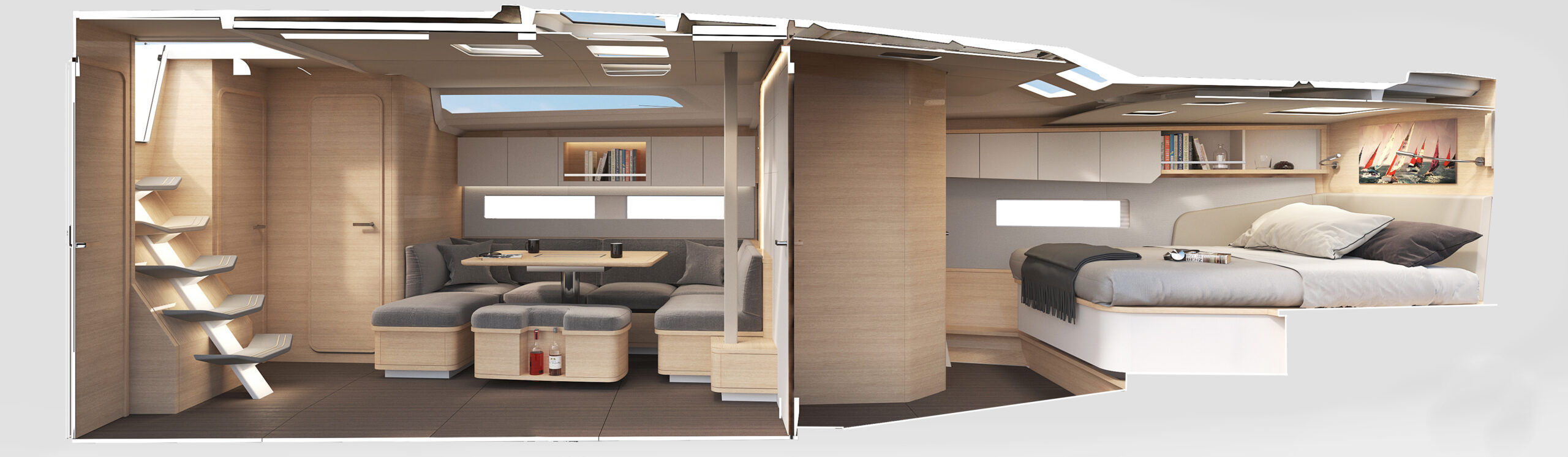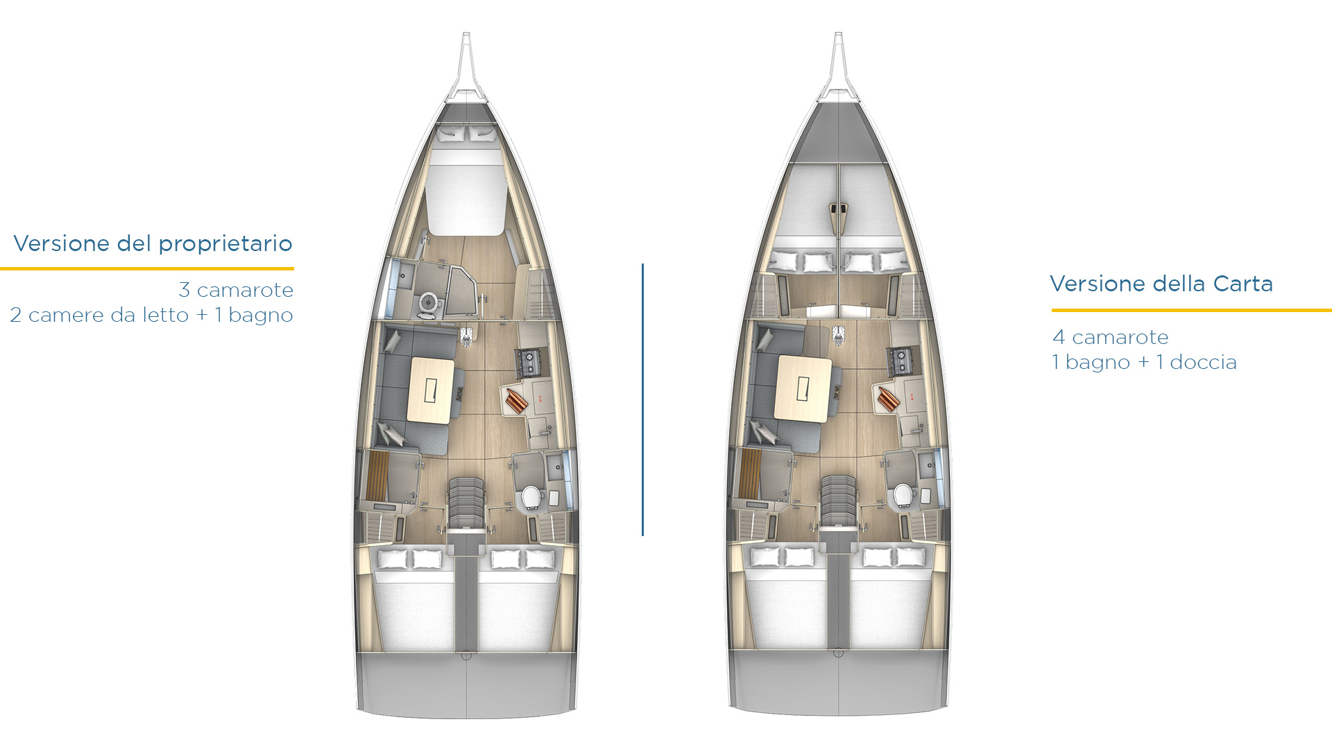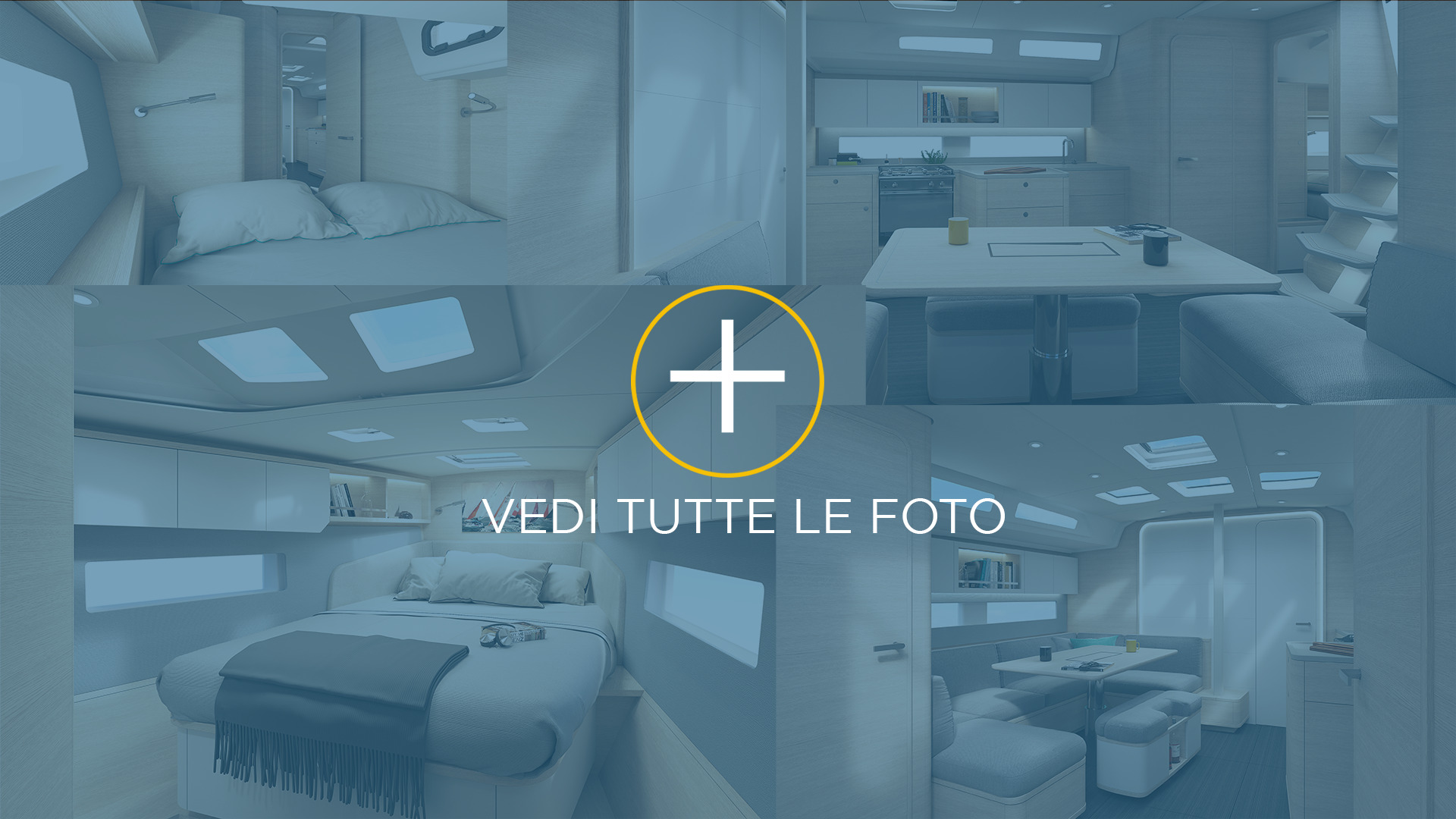 Questa nuova barca a vela è proposta in due versioni con 3 o 4 cabine che presentano una configurazione simile, con un salone spazioso, una cucina laterale funzionale e centrale e due cabine di poppa con un’altezza libera notevole.